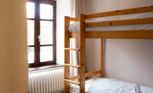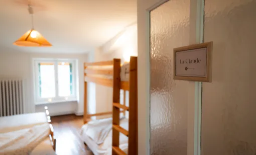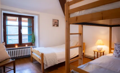 La chambre "Claude" pour 4 personnes composée d’un lit superposé et de deux lits jumeaux....
