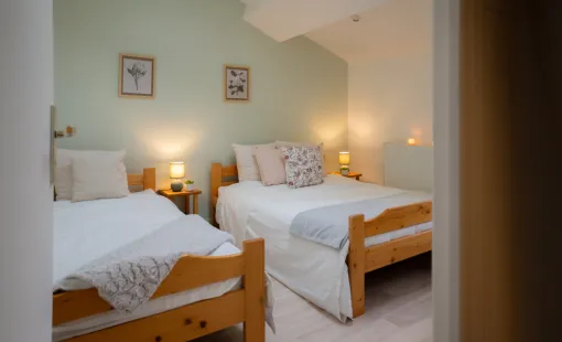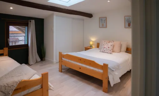 La chambre "Laurence" pour trois personnes composée d’un lit double et d’un lit simple. ✨Elle est idéale pour une petite famille ou un groupe d’amis....